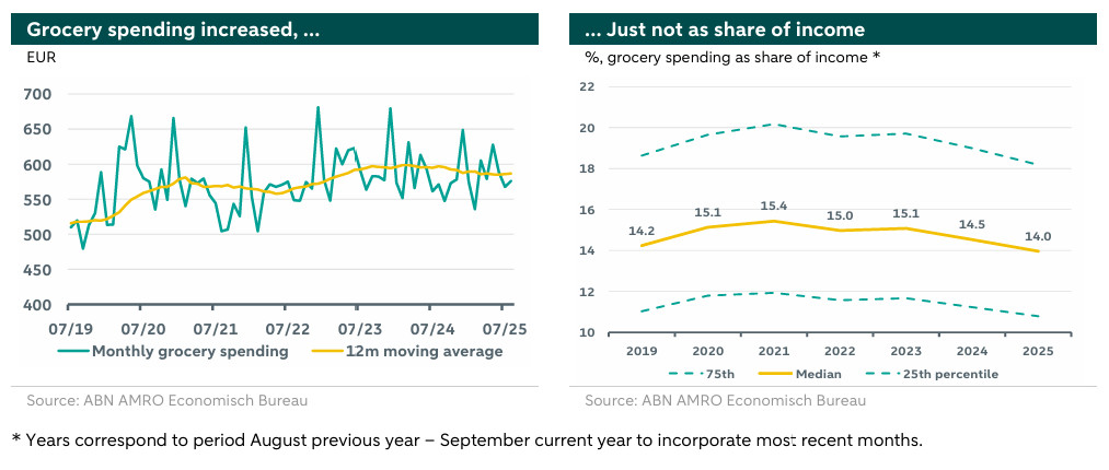 In the left-hand figure below, the median monthly grocery expenses are shown in green, alongside the same series represented as a rolling annual average in yellow. In addition to a clear seasonal pattern, such as increased spending during the December holiday season, we can also observe the start of the COVID pandemic in March 2020. Due to lockdowns, spending shifted from dining out to groceries. The rising rolling average demonstrates that households are spending significantly more on groceries in 2025 than they did in 2019. Grocery expenses over the past seven years have increased from approximately 520 euros per month to around 585 euros per month.