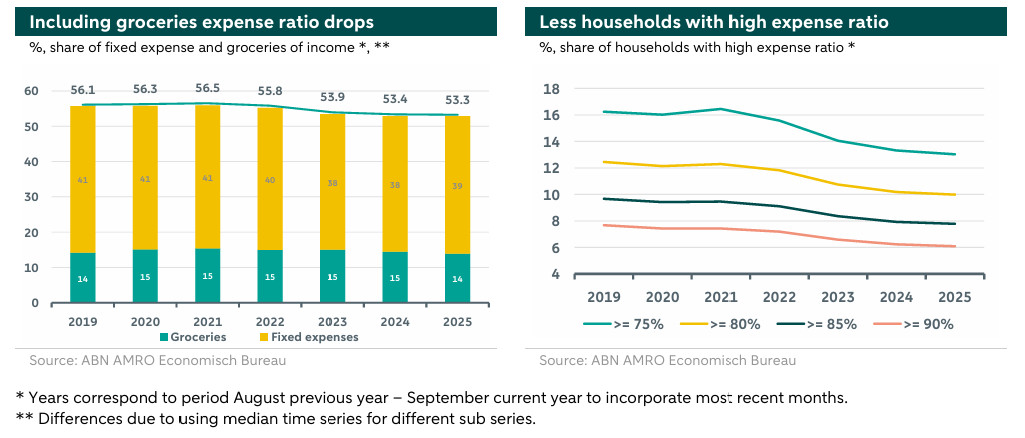 With the upcoming elections and government formation, cost of living pressures and purchasing power are likely to regain attention, especially due to the persistently higher inflation in the Netherlands compared to neighboring countries. Our analysis provides a current snapshot of approximately 150,000 households, whose primary income source is a salary, up to August 2025, focusing on one measure of cost of living: the percentage of income spent on fixed expenses and groceries.