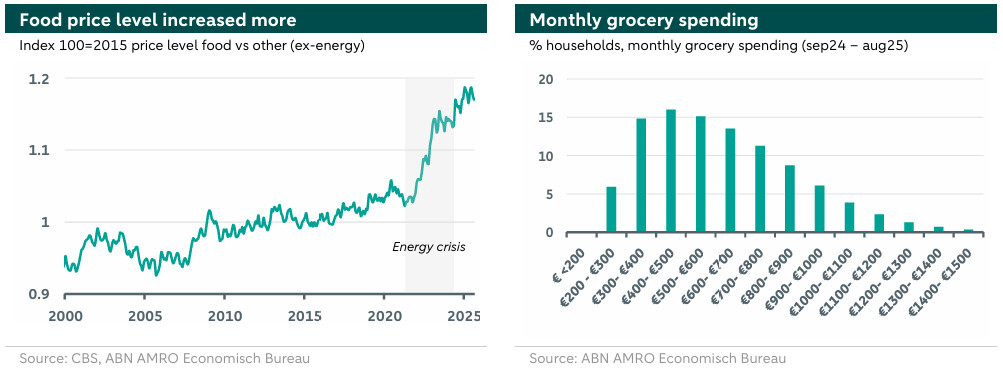 Grocery prices, defined here as food prices, have risen significantly in recent years. Compared to three years ago, food prices are roughly 20% higher. In fact, the price of food has increased more sharply than the price of other products. This relative relationship between food prices and other prices is illustrated in the left-hand graph below, which shows the ratio between the price level of food and other products (excluding food and energy). Since roughly the energy crisis, a clear structural break is visible, with the price level of food increasing more rapidly than that of other products.