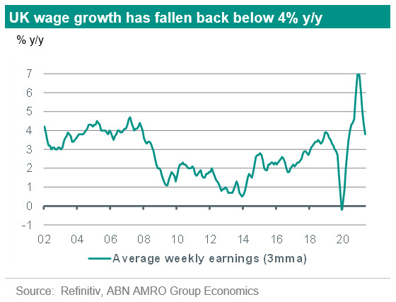 Second, and crucial for the medium-term outlook for inflation, is that wage growth in the UK – while elevated – is (unlike in the US) well within pre-pandemic ranges, with the recent strength reflecting catch-up from the weakness in wage growth seen early on in the pandemic (see chart below). Indeed, the November labour market report showed wage growth dipping back below 4% on an annual basis. While there are upside risks to the outlook for wage growth given the tightness in the labour market, there are a number of structural forces keeping a lid on wages that will be hard to budge – for instance, significant pay restraint in the public sector (1/5 of the labour force). It looks unlikely therefore that wages will rise faster than inflation itself, and this is what will be needed for inflation to become self-reinforcing over the medium term. Given this, while we expect inflation to remain elevated in the UK over the coming year, price pressure should dissipate substantially in the second half of the year, which should leave the BoE comfortable with a more gradually sloping path for interest rates than markets are currently pricing in.