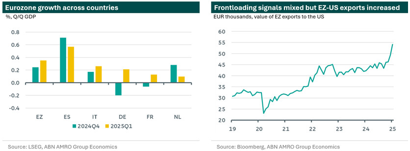 Eurozone Q1 growth surprised to the upside at 0.4% q/q (consensus 0.2%, ABN AMRO 0.3%) after growing by 0.2% q/q in 2024Q4. While the full breakdown is published later, the chances of an upside surprise increased after yesterday’s GDP releases, amongst which an Irish blowout (3.3% q/q), possibly due to frontloading as Ireland’s role as tax base for US multinationals, and a Spanish surprise (0.7% q/q). But even without Ireland there was some genuine strength. Next to Spain, Italy and Germany (see below) noted a solid start to the year. While the eurozone aggregate breakdown, as well as the country breakdowns lack at this stage, according to statistical offices, domestic demand has been a driver of growth in most countries. This fits the incoming data which showed solid momentum across industry, construction and services. As well as our view of elevated but easing wage growth, together with inflation moving towards target, leads to real income gains. Alongside the positive credit cycle this should lead to increased spending by consumers in the eurozone.