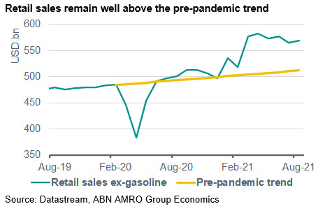 In this Daily: - US Macro: Consumption continues to defy gravity – Retail sales unexpectedly rose by 0.7% m/m in August, contrary to expectations for a fall (consensus: -0.7%; ABN: -1.5%); - China Macro: Downgrading our 2021 growth forecast on Delta – Over the summer, Beijing's zero tolerance approach towards new (Delta) outbreaks formed a clear headwind for economic activity, with the services sector particularly affected