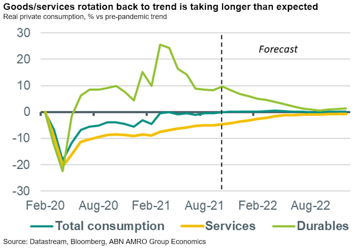 The shift in consumption from goods back to services is taking considerably longer than we previously thought, driven to some extent by the spread of the Delta variant in the US over the summer months, which weighed on the services recovery. While the vaccination rate in the US is on the low side, at 71% of the adult population, serological studies suggest that perhaps 1/3 Americans have already had covid-19, suggesting the true level of immunity in the population is likely higher now than suggested by the vaccination rate.