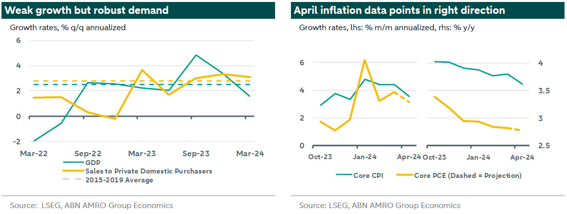 Such interest rate cuts depend crucially on inflation developments in the coming months. After unexpectedly hot readings in Q1, the headline and core inflation readings of 0.3% m/m in April brought a welcome relief after three months of no progress. In the absence of weakening labor markets, we will need stronger evidence of disinflation in the coming months for the Fed to start cutting rates in July. The April reading was an important first step for at least two reasons. First, it was sufficiently low for y/y inflation to restart its disinflationary trajectory, and second, it crucially showed a slowing in the all-important housing inflation component. As previously flagged in our coverage of the 1 May FOMC meeting (link), we think we will need to see three benign inflation readings for the Fed to have the confidence to start lowering rates in July. As we go to publication, the core PCE inflation data for April is expected to come in at 0.3% m/m, but – consistent with the CPI data for April – the details are likely to show reduced pressure from transportation services such as car insurance, and a continued pass-through of disinflation in housing. Our base case still sees such a number as consistent with a rate cut at the 30-31 July FOMC meeting, assuming the May and June data show further progress, but our view is increasingly challenged by commentary from Fed officials suggesting this might not be enough for the Committee to move so soon.