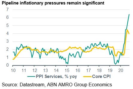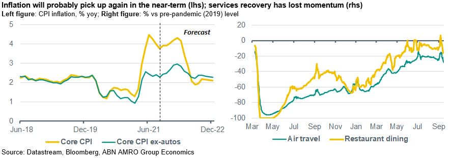 We still think inflation has peaked, but a renewed acceleration is likely in the coming months – We think we are past the peak in US core inflation, both on a monthly and an annual basis. However, annual inflation will remain elevated over the coming months given the low base of last year, and monthly inflation is unlikely to stay at the current subdued level for very long, for three reasons. First, although used car prices are now becoming a drag on inflation, the decline in wholesale prices has been less than we anticipated given the drop-off in demand we have seen – likely due to the continued manufacturing bottlenecks for new cars, which have led to renewed plant closures among some auto makers. Second, we do not expect weak services inflation to last. , we appear to be past the worst of the Delta wave of cases and hospitalisations, and recent indicators confirm this.