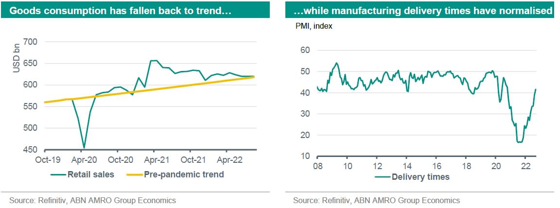 The overheated US economy is gradually cooling off. Goods consumption was largely stagnant in real terms over July-August, and we estimate that it is now basically back at trend – following nearly two years of well above trend demand. This comes against a backdrop of an easing in most supply-side bottlenecks, with PMI delivery times now back to normal, and pipeline cost pressures easing – both materials and logistical services cost growth has come down. At the same time, the cooling in the economy has not been disorderly, at least so far – despite the abrupt U-turn in monetary policy early this year. While the composite PMI plunged in August, the September flash reading – though still weak – was a big improvement, and suggested that the August data were an anomaly. The US economy is, in short, achieving a largely soft landing in our view.