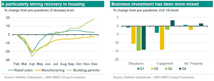 Alongside consumption, other parts of the economy have recovered at a similarly rapid pace. Housing investment has recovered particularly strongly, with housing starts the highest in 14 years. While some of this strength reflects pent-up demand from the lockdown period, it is encouraging that building permit approvals, a strong leading indicator for housing investment, have continued to surge, and are now at their highest level since 2004. Combined with the strong housing market – with prices rising 9.5% yoy as of November – this bodes well for housing investment over the coming quarters.