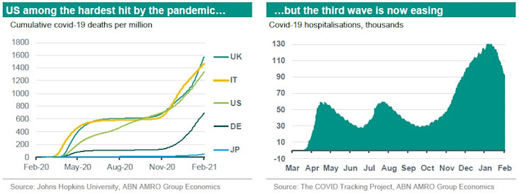 To understand where the US economy is headed this year, it is important to first understand why the economy has been much less hard hit than others. Although its third wave in the pandemic is now easing, the spread of new, more transmissible covid-19 variants could potentially mean it will enter a fourth wave over the coming months (notwithstanding the vaccine rollout, which is discussed later). By almost any public health metric, the US has been among the hardest hit among developed economies by the pandemic – it has among the highest cumulative cases, hospital admissions, and deaths per capita. Despite this, the lockdown restrictions have been comparatively mild. To some extent, this can be explained by politics: Republican-run states have been much less willing to impose lockdowns than those run by Democrats. However, it also appears that – barring some notable exceptions such as California – the second and third waves have not burdened healthcare systems quite as severely as the first wave. Indeed, while aggregate hospitalisations have been higher in the US, the geographical spread has been more even; no single state has seen hospitals strained as much as those in New York were in the first wave of the pandemic.