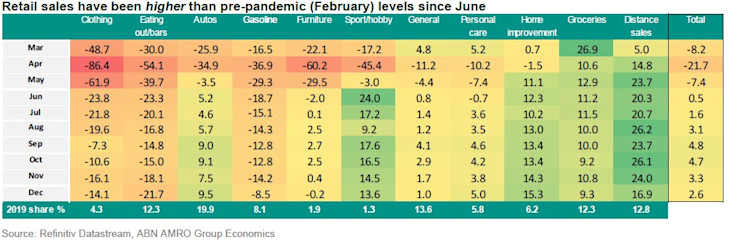 More limited lockdown restrictions has meant a much smaller decline in activity. This is confirmed by the Google Mobility data, which shows around a 20% yoy decline in visits to retail & recreation establishments in January, compared to more than 50% declines in most European countries. The OpenTable seated dining data shows that although hospitality has indeed taken a renewed hit, that hit is nonetheless much smaller than during the first round of lockdowns; restaurant dining is running at around half of normal capacity, whereas restaurants were completely closed in the first wave of the pandemic.