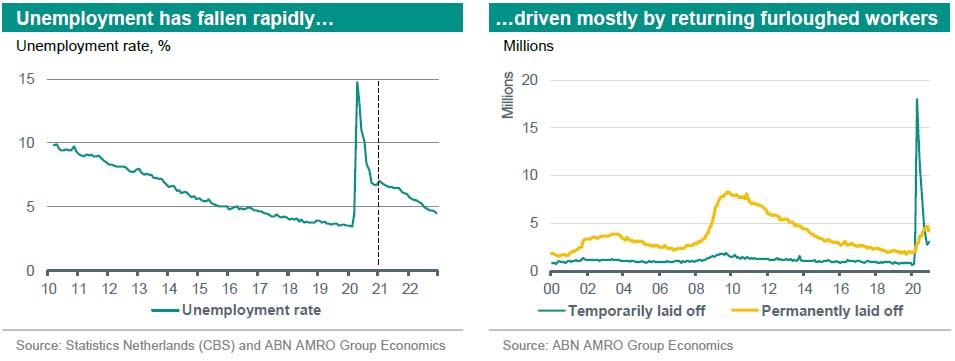 In addition to much milder lockdown restrictions, consumers have also surprised in their ability to substitute away from spending on restaurants and bars to higher physical goods consumption. This has likely been spurred by aggressive fiscal support, including two rounds of stimulus checks totalling $1800 per person (distributed to all but the highest earners), as well as generous top-ups to unemployment benefits that meant up to 40% of workers had been financially better off than when they were employed.