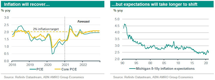 The one big potential spoiler to President Biden’s ambitious spending plans is arguably inflation. Large deficits and a rising debt ratio can only be justified while interest rates remain low. While the Fed’s new policy framework gives it more leeway to keep rates lower for longer, a significant and sustained rise in inflation would be hard to tolerate for very long. Although inflation is expected to pick up this year, we do not expect it to be sustained. Base effects and higher oil prices will push inflation higher in the first half of the year, with the CPI measure peaking at around 3% yoy in April/May (PCE inflation – the Fed’s target – will peak at around 2.5%), before rapidly falling back as these base effects fall out. Later in the year, we expect a more meaningful recovery in core inflation, driven by a catch-up growth in housing rents, which were largely frozen during the pandemic. This will likely be enough to convince the Fed to taper asset purchases by next year. However, in order for higher inflation to be sustained, we would need to see this accompanied by a rise in long-run inflation expectations. History has shown us that inflation expectations tend to move only very slowly. As such, we are unlikely to see a significant and sustained rise in inflation expectations in the near term. However, with the output gap closing in early 2022, and large-scale fiscal stimulus potentially stoking some demand side pressures, it is possible that we see this further out – perhaps in 2023. This would not be soon enough to derail President Biden’s public investment agenda, but it could well mean we see a rate hike from the Fed by late 2023. However, with the neutral rate likely to have fallen even further since the pandemic, and the Fed’s stated desire to see higher average inflation over the business cycle, we expect any rate hikes to be much more gradual and limited than we saw in the previous cycle.