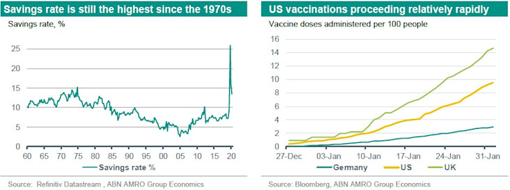 Looking ahead, consumption will remain supported by a fall in the elevated savings rate – which, at 13.7% in Q4, is the highest level since the mid-1970s – as well as further massive fiscal support in the form of a new $1.9trn (10% of GDP) package currently being debated in Congress. The latter proposes to extend generous top-ups to unemployment benefits, distribute yet another round of stimulus checks, as well as support for healthcare and state & local governments. We expect this to add 1.9pp to growth in 2021, and 0.6pp in 2022. With that said, further consumption gains will depend significantly on the scale of further reopening, which naturally will depend on the pace of vaccinations and the course of the virus itself. With regards vaccines, the US has been inoculating citizens at a relatively rapid pace of almost 1.5 million doses per day, enough for around 0.5% of the population. This is lower than the pace seen in the UK (which is inoculating 0.6% per day), and much lower than Israel (1.9% per day), but is likely to continue accelerating in the coming weeks as supply constraints ease. Considering up to 1/5 of Americans may already have acquired natural immunity, it is likely that enough of the population will have been vaccinated to provide sufficient relief to hospitals by the time the more transmissible new variants come to dominate – something epidemiologists expect to happen in March.