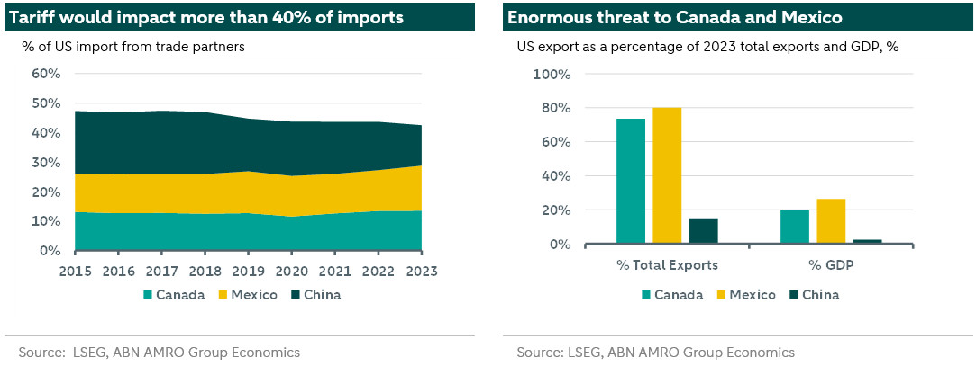 We got an early preview of the highly uncertain and volatile trade environment we should expect in the coming years. Governments were scrambling to react, using different strategies to try and deter the tariffs. Importantly, it has become clear that President Trump does not only want to use tariffs to – in his eyes - support the US economy, but also to harm other economies and obtain non-economic goals. We see the current episode as mostly reflecting Trump’s ‘Art of the Deal’; Come with a bold and terrible offer, and hope to land on something sensible. It fits into what Treasury secretary nominee Bessent described as an ‘escalate-to-deescalate’ strategy. In his first term, Trump also threatened Mexico with tariffs in retaliation for the number of migrants crossing the borders. This ultimately fizzled out in 2020, and that is also the likely course for this threat. The missing piece of the information is the status of the campaign promise of universal tariffs to all imports, the phantom tariff scaring all trade partners.
