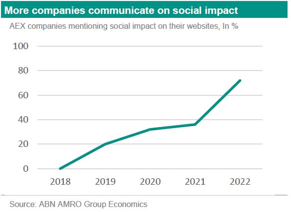 Social impact is becoming more and more important for companies. At least, when one looks at their communication. For instance, of the companies that are listed on the Dutch benchmark stock index, the AEX, 72% now mention social impact in some way on their websites. This was 0% five years ago. Half of the companies mentioning social impact focus do so by focusing communication on how social impact is provided for others, such as banks providing the possibility to invest in social impact.