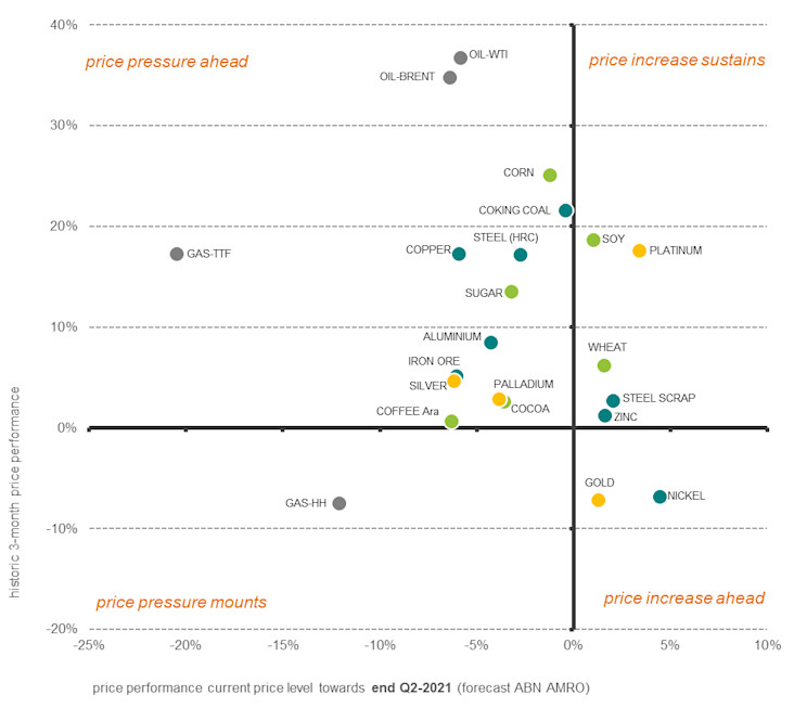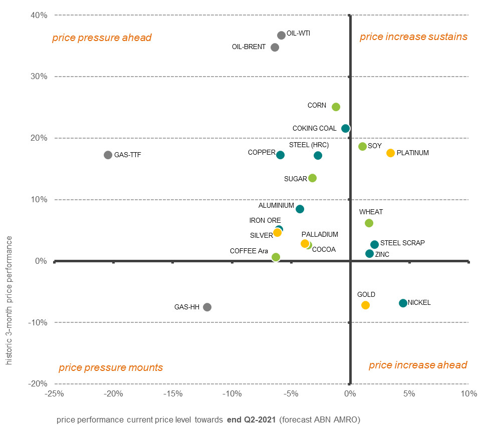 We think that buoyant sentiment has the upper hand in the recent run-up in commodity prices. Some commodity markets are indeed tight, but most markets still have abundant supplies. The fact that commodity market sentiment is currently this resilient, is mainly due to targeted economic support measures (in construction, infrastructure, renewables). Next to that, generally loose monetary policy increases liquidity. Downside commodity price risks arise as soon as the targeted support and/or accommodative monetary policy eases.