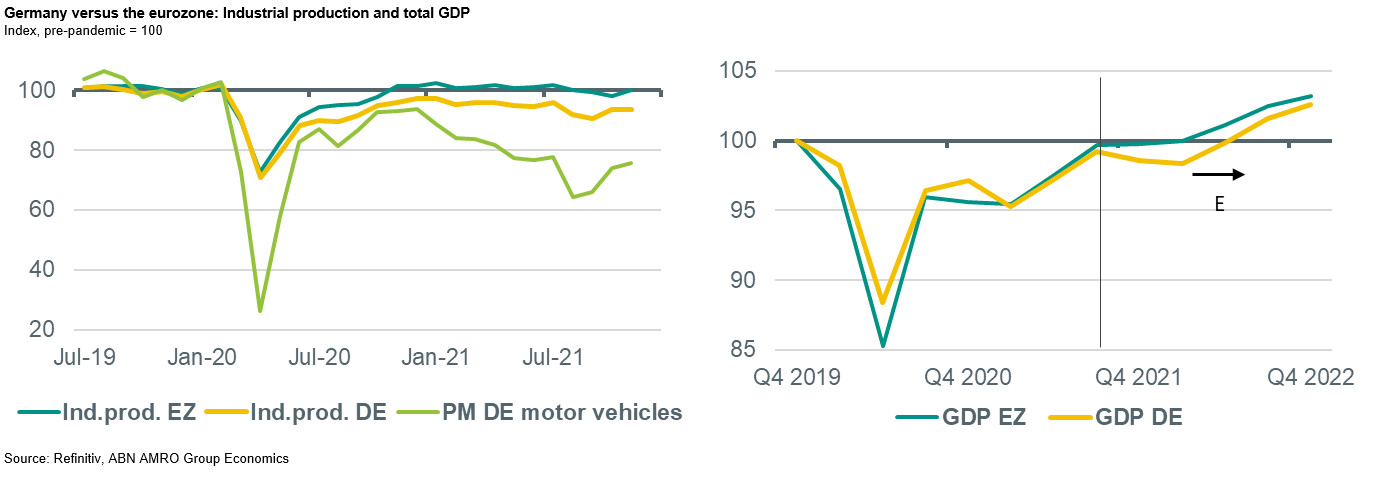 A first indication for the damage of the ongoing supply side bottlenecks in global trade and the spread of Omicron in the final months of 2021 was given by Germany’s statistical office at the end of last week. It published the first estimate for GDP growth during the year 2021 as a whole, which came in at 2.7%, following a 4.9% contraction during 2020. According to reports in the press, an official of the statistical office mentioned that GDP contracted by between 0.5% and 1.0% qoq in 2021Q4. Such a contraction would be below our own and the consensus expectations. However, it seems that previous quarters will be revised higher as the combination of the annual average growth during the year and the first estimate for the contraction in Q4 implies that growth during 2021 Q1-Q3 was higher than published before. In any case, the level of Germany’s GDP was probably roughly 1.5% below its pre-pandemic level in 2021Q4, a much wider gap than that for the eurozone as a whole of around -0.25% (i.e. the eurozone excluding Germany will be slightly positive). We expect the gap between Germany and the eurozone to narrow during the course of this year and the next.