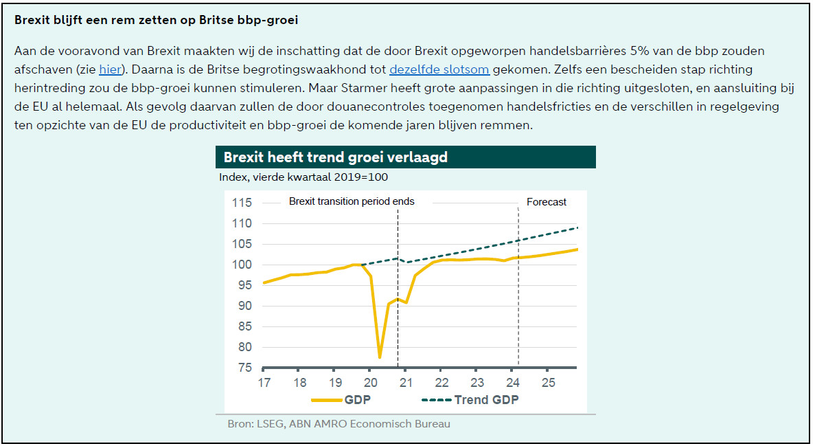 Dit laatste wil niet zeggen dat het Britse beleid ten aanzien van Europa helemaal gelijk blijft als Starmer straks aan het roer staat. De Conservatieven zetten de afgelopen jaren in op handelsdeals. Afgezien van enkele deals met ver gelegen, kleinere economieën kwamen zij van een koude kermis thuis. De interesse bij grotere partners zoals de VS en China viel helaas tegen. Starmer zal naar verwachting aansturen op Brits beleid dat niet te veel uit de pas loopt met dat van de EU om daarop mee te liften. Maar ook niet veel meer dan dat. Aansluiting bij de Europese Unie zit er dus voorlopig niet in.