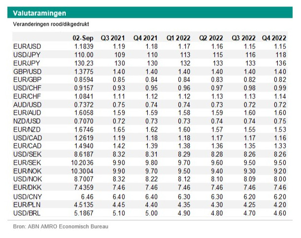 Op donderdag is de ECB aan zet. De ECB heeft haar strategische herziening gedaan. Hierdoor is het inflatiedoel veranderd van onder maar dichtbij 2% naar 2%. In juli communiceerde de ECB het volgende. “Ter ondersteuning van de symmetrische inflatiedoelstelling van twee procent en in overeenstemming met zijn strategie voor het monetair beleid verwacht de Raad van Bestuur dat de basisrentetarieven van de ECB op hun huidige niveau of lager blijven totdat de Raad heeft vastgesteld dat de inflatie ruim vóór het einde van de projectieperiode en duurzaam voor de rest van de projectieperiode twee procent bereikt. De Raad is van oordeel dat bij de onderliggende inflatie voldoende vooruitgang is geboekt, zodanig dat deze in overeenstemming is met de stabilisering van de inflatie op twee procent op middellange termijn. Dit kan ook betekenen dat de inflatie gedurende een overgangsperiode gematigd boven de doelstelling uitkomt”. Het zou goed mogelijk zijn dat de rente pas na 2024 voor het eerst omhoog gaat (zie onze Engelstalige publicatie Global Monthly – Inflation: how big is the risk?). Daarom rekenen er dan ook op dat de ECB verruimingsgezind blijft klinken volgende week. We zien dan ook geen reden voor een verdere stijging van de euro ten opzichte van de Amerikaanse dollar, tenzij de Amerikaanse dollar meer onder druk staat.