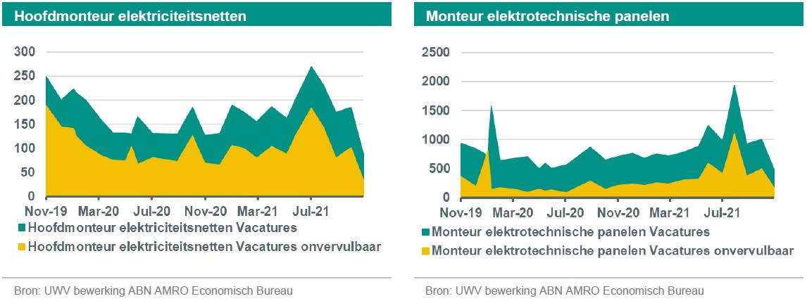 Eind november 2021 is voor eenvijfde van de openstaande vacatures in beroepen rondom de aanleg van een energie-infrastructuur geen geïnteresseerde werkzoekende (zie voor onze methode voor het berekenen van het percentage onvervulbare vacatures). In de figuur hieronder staan twee beroepen waarnaar veel vraag is; de monteur van elektrotechnische panelen en de hoofdmonteur elektriciteitsnetten. Voor beide beroepen geldt dat bijna de helft van de vacatures nu al moeilijk vervulbaar zijn. De Kabinetsplannen voor de energieinfrastructuur vertalen zich voor een fors deel van die 22 miljard euro in loonkosten voor dit type zeer moeilijk te vinden werknemer.
