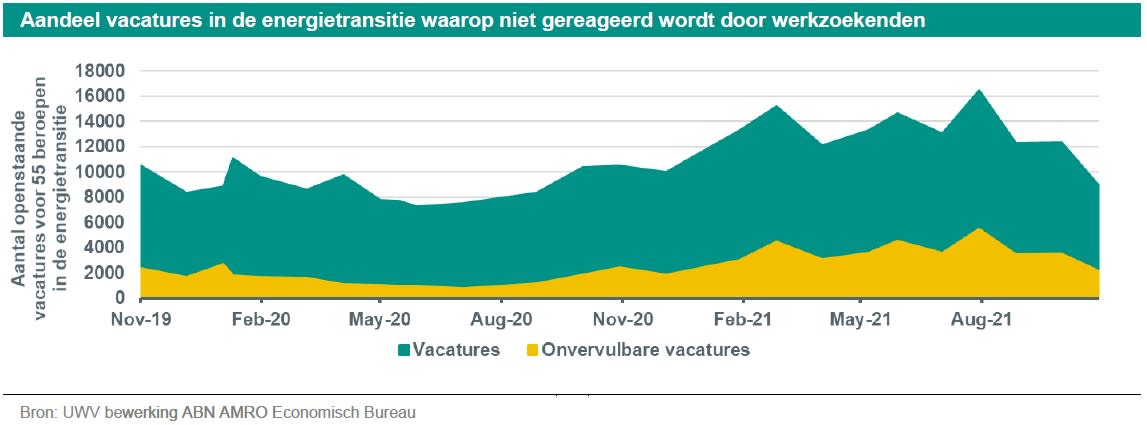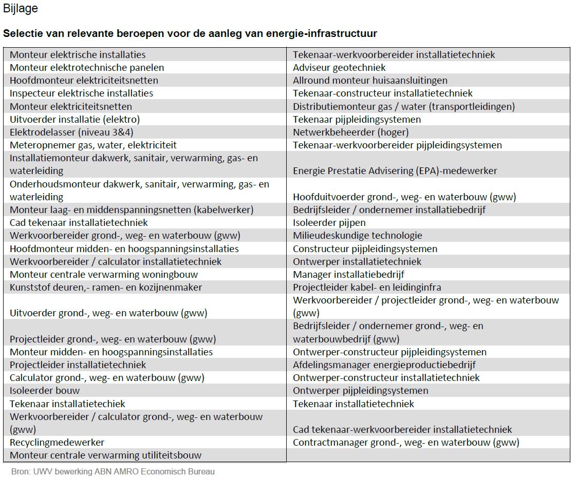 Directe investeringen van de nieuwe regering gaan vooral naar de bouw van een kerncentrale (5 miljard euro) en het aanleggen van een energieinfrastructuur (22 miljard euro). Deze laatste investering start in 2023 met 700 miljoen euro en verdubbelt in 2024 en in 2025. Wij verwachten dat de haalbaarheid van deze investeringen tegen de uitdaging van personeelstekorten zal oplopen. Omdat dit verreweg de grootste kabinetspost is op het terrein van het klimaat en omdat deze uitgaven al volgend jaar van start gaan, hebben wij een hieronder voor 55 beroepen (zie bijlage) die nodig zijn om deze ambitie uit te voeren, de arbeidsmarktsituatie geanalyseerd.