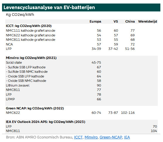 Hieronder staat een overzicht van de LCA van de verschillende chemische samenstellingen van batterijen. Niet alleen de chemische samenstelling is belangrijk, maar ook waar de batterijen worden geproduceerd. In Europa geproduceerde batterijen hebben bijvoorbeeld de laagste levenscyclusemissies. Dit komt omdat de energie die wordt gebruikt om batterijen te produceren in Europa meestal meer afkomstig is van hernieuwbare bronnen dan bijvoorbeeld in China.