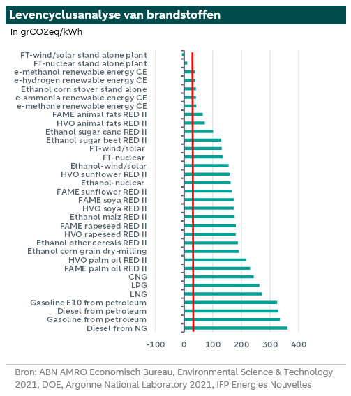 De rode lijn in de tabel laat zien welke brandstoffen die gebruikt worden in auto's met verbrandingsmotor kunnen concurreren met batterij-auto’s. De brandstoffen links van de rode lijn kunnen concurreren op het gebied van levenscyclusemissies, de brandstoffen rechts van de rode lijn hebben een hogere levenscyclusemissie. Zie meer hierover hieronder.