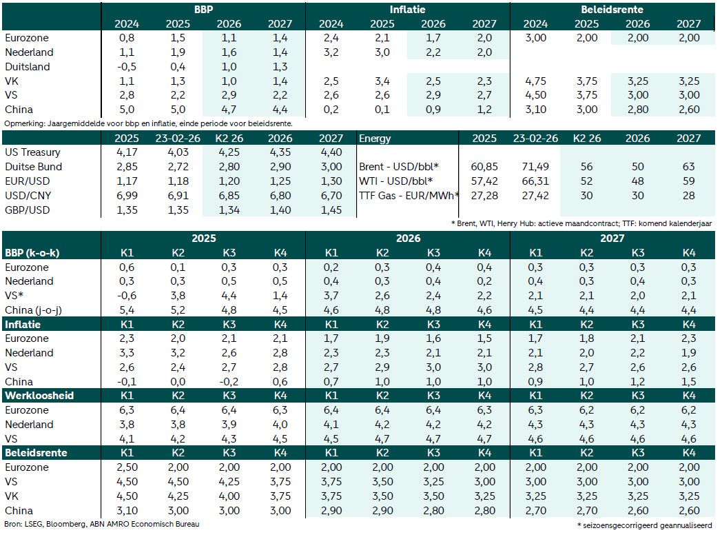 De overgang van de ene wereldorde naar de andere is in volle gang, maar het is nog steeds onduidelijk hoe die nieuwe wereldorde eruit zal zien. De opkomst van AI, de stijgende invloed van China en de relatieve terugval van de VS brengen uitdagingen met zich mee, maar ook kansen. Amerikaanse invoertarieven blijven een rem op de wereldhandel, ondanks de recente uitspraak van het Amerikaanse Hooggerechtshof. Toch is de mondiale groei veerkrachtig gebleven, ondanks de tegenwind. In ons basisscenario verwachten we dat deze veerkracht aanhoudt, zij het met aanzienlijke risico’s. De groei in de VS zal naar verwachting solide blijven, maar dit maskeert variatie en kwetsbaarheden onder de oppervlakte. De groei in de eurozone zal naar verwachting aantrekken door hogere Duitse overheidsuitgaven, terwijl China mogelijk bescheiden maatregelen neemt om de vraag te stimuleren en tegelijkertijd zijn industriële groeimodel in stand houdt. De inflatie in de VS zal naar verwachting oplopen, maar in de eurozone over het algemeen gematigd blijven. Desondanks zal de divergentie tussen Fed‑ en ECB‑beleid naar verwachting aanzienlijk afnemen, waarbij de ECB de rente waarschijnlijk stabiel houdt en de Fed door de inflatie-overschrijding heen kijkt en de arbeidsmarkt prioriteit geeft door de rente verder te verlagen.