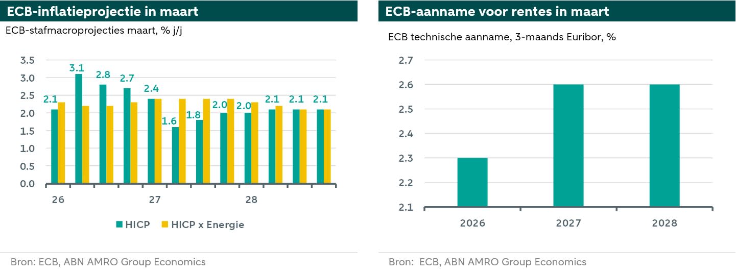 De macroprojecties van de ECB-staf waren al consistent met hogere rentes, waardoor recente ontwikkelingen de onderbouwing alleen maar versterken. Hoewel het centrale scenario de inflatie tegen eind 2028 min of meer terug bij de doelstelling liet uitkomen (zie grafiek hieronder links), was hierin al het dempende effect van tussen twee en drie renteverhogingen verwerkt (zie grafiek rechts). Dit komt doordat de ECB voor veel variabelen marktveronderstellingen gebruikt bij het opstellen van projecties en daarom de door de markt geïmpliceerde rente in de aanloop naar de vergadering heeft meegenomen. Dit suggereert dat die renteverhogingen noodzakelijk zouden zijn om de inflatie in 2027-2028 terug te brengen naar de doelstelling.