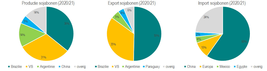 De sojabonenmarkt kent drie belangrijke spelers: de VS, Brazilië en China. Brazilië en de VS hebben gezamenlijk tweederde van de mondiale productie van sojabonen en een collectief aandeel van bijna 85% in de exportmarkt. En de grootste volumes gaan richting China als veevoer voor varkens. Deze sojabonentriangel bepaalt in grote mate het marktsentiment.