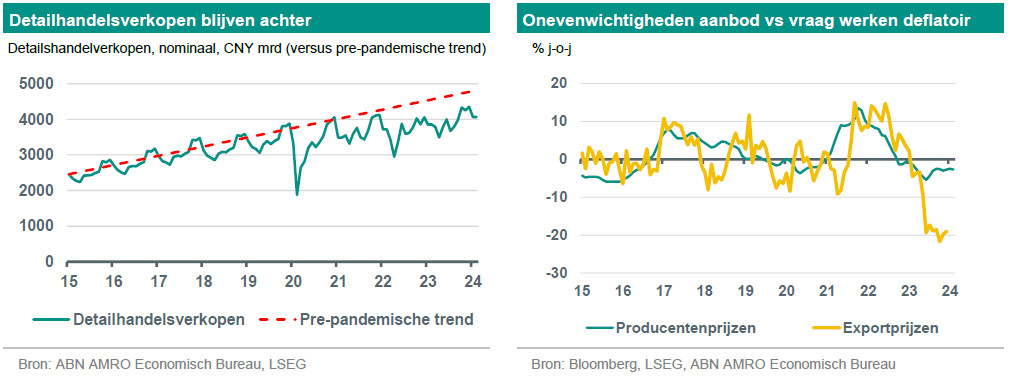 Recente macrodata wijzen op een stabilisatie – maar wel met aanhoudende onevenwichtigheden, waarbij de aanbodzijde sterker is dan de vraagzijde. Dat draagt bij aan mondiale desinflatie, maar leidt ook tot handelsspanningen. De groeidoel-stelling van 'ongeveer 5%' die begin maart werd aangekondigd, is dezelfde als die van vorig jaar. Maar omdat er dit jaar geen “heropeningsbonus” is, wordt de lat feitelijk hoger gelegd (met nog steeds tegenwind vanuit de vastgoedsector en de mondiale omgeving). Dat verklaart waarom premier Li Qiang aan de doelstelling toevoegde dat deze niet gemakkelijk te halen zal zijn. Opvallend genoeg zien we nog geen beweging in de consensus in de richting van deze groeidoelstelling (huidige mediane schatting voor groei in 2024: 4,6%, ABN AMRO: 4,7%). De vraag blijft of de door Beijing aangekondigde extra (begrotings)stimulans voldoende zal zijn – met name om het sentiment in de particuliere sector te verbeteren en de negatieve vertrouwensspiraal in de vastgoedsector te doorbreken (zie: China – 2024 growth target more ambitious than support plans). De vastgoedsector vormt nog steeds de grootste rem op de groei. Al met al houden we onze groeiprognoses voorlopig ongewijzigd, waarbij de opwaartse en neerwaartse risico's momenteel in evenwicht lijken.
