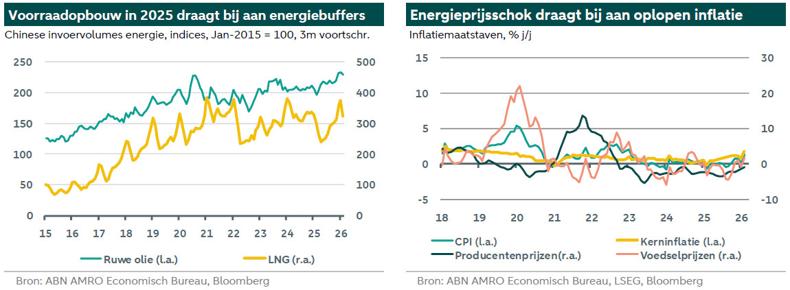 Macro-economische cijfers positiever voorafgaand aan de escalatie in het Midden-Oosten. Lichte aanpassing van onze groeiramingen voor 2026 en 2027 als gevolg van het Iran-conflict. Ondanks aanhoudend aanbodoverschot verhogen we inflatieramingen vanwege de energieprijsschok.