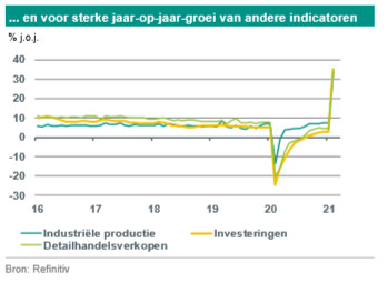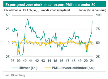 Begin deze week werden de maandelijkse macrodata voor januari en februari gepubliceerd. De industriële productie en de detailhandelsverkopen kwamen iets beter uit dan verwacht, terwijl de investeringen in vaste activa in stedelijke gebieden achterbleven bij de verwachtingen. De groei van de industriële productie in januari en februari bedroeg 35,1% j-o-j (consensus: 32,2%). De detailhandelsverkopen kwamen uit op 33,8% j-o-j (consensus: 32,0%). De investeringsgroei was 35,0% j-o-j (consensus: 40,9%). Eerder deze maand kwamen de export- en importgegevens veel sterker uit dan verwacht (zie hieronder). Zoals eerder aangegeven, zeggen deze sterke groeicijfers op jaarbasis niet zoveel over het huidige momentum, omdat ze grotendeels de zeer zwakke basis van een jaar geleden weerspiegelen, toen China enkele weken op slot zat na de eerste verspreiding van het coronavirus.