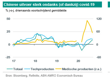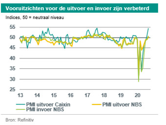 Wat daarnaast ook heeft bijgedragen aan het Chinese herstel is de effectieve inzet van faciliterend overheidsbeleid. In de meeste welvarende landen hebben de overheden het pandemische herstelbeleid vooral gericht op de vraagzijde. In China is de aandacht aanvankelijk vooral uitgegaan naar de aanbodzijde. De overheid heeft al eind februari de industriebedrijven opgeroepen de productie weer op te starten en heeft hen daarbij ook gefaciliteerd. Dit alles had tot gevolg dat de Chinese industrie eerder dan buitenlandse concurrenten de productie bestemd voor de wereldmarkt weer kon opstarten. Verder heeft de Chinese uitvoer opmerkelijk genoeg ook geprofiteerd van de pandemie. De uitvoer van medische apparatuur inclusief gezichtsmaskers is zeer sterk toegenomen. Ook de uitvoer van computers en gerelateerde producten deed het beter dan gemiddeld; dat hangt waarschijnlijk samen met de wereldwijde verschuiving naar thuiswerken. China is sterk gepositioneerd in dit soort producten. Dit alles was zichtbaar in een solide ontwikkeling van de Chinese uitvoer in het laatste half jaar, ondanks de lockdowns-gerelateerde ineenstorting van de mondiale groei en de wereldhandel in het tweede kwartaal. De verbeterde vooruitzichten voor de uitvoer en de invoer zijn ook zichtbaar in een duidelijke stijging van de PMI-subindices voor de uitvoer en invoer, die inmiddels weer hoger zijn dan het neutrale niveau van 50.
