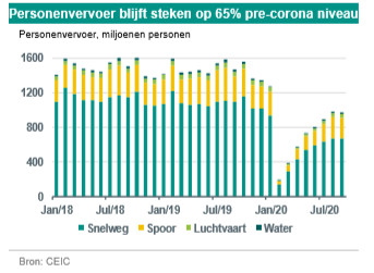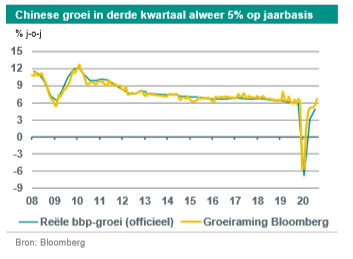 Afgelopen maandag werden de bbp-cijfers over het derde kwartaal gepubliceerd. Deze toonden aan dat de tweede economie van de wereld in juli-september alweer met maar liefst 4,9% j-o-j groeide (consensusverwachting: +5,5%, tweede kwartaal: +3,2%). Dat is indrukwekkend, als je bedenkt dat de Chinese economie in het eerste kwartaal van dit jaar nog een historische krimp van bijna 7% op jaarbasis doormaakte. De groei op kwartaalbasis kwam in het derde kwartaal uit op 2,7% k-o-k (consensus: +3,3%, na een inhaalgroei van 11,7% in het tweede kwartaal). Dat de groei toch iets lager uitkwam dan verwacht hangt waarschijnlijk samen met de recente groeiversnelling van de invoer. Ook illustreert dit dat bepaalde dienstensectoren (zoals transport) nog niet geheel hersteld zijn van de covid-19-schok. Al met al hebben we, nu de bbp-cijfers over het derde kwartaal beschikbaar zijn, onze groeiraming voor geheel 2020 marginaal bijgesteld, van 2,0% naar 1,8%. We laten onze groeiraming voor 2021 ongewijzigd op 8,0%. We voegen er nog maar eens aan toe dat de verwachte versnelling van de groei op jaarbasis in 2021 vooral wordt gedreven door basiseffecten, omdat het extreem zwakke eerste kwartaal van dit jaar uit de cijfers zal verdwijnen.