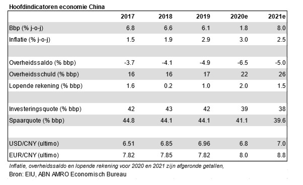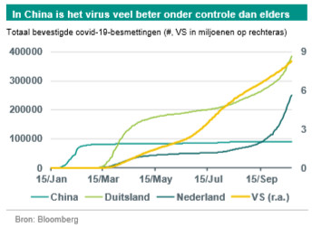 Al met al blijft China de enige belangrijke economie waarvoor we dit jaar een positieve jaargroei (1,8%) verwachten. Dat is een schril contrast met de verwachte krimp van bijna 5% en 7,5% die we dit jaar verwachten voor respectievelijk de VS en de eurozone. Volgens ons is de belangrijkste reden waarom China het beter doet het feit dat het land de pandemie veel beter onder controle heeft, ook al ontstond covid-19 in China zelf. Dat succes is in de eerste plaats te danken aan effectief beleid (lockdowns en andere veiligheidsmaatregelen, track and trace en uitgebreid testen). In de tweede plaats speelt ook een ander governance model een rol. Denk bijvoorbeeld aan minder beperkingen op het vlak van de privacy-wetgeving. Daardoor kan China gebruik maken van geavanceerde mogelijkheden op het vlak van IT, zoals persoonlijke gezondheidscodes.