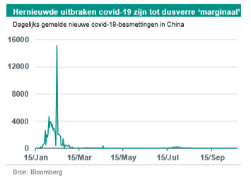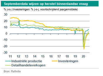 Het Chinese herstel van de covid-19-schok wordt geleid door de industrie en de aanbodzijde. Maar met enige vertraging laat ook de binnenlandse vraag een duidelijk herstel zien. De macrocijfers over september toonden dat duidelijk aan. De groei van de detailhandelsverkopen steeg naar 3,3% j-o-j (consensus: +1,6%, augustus: +0,5%). De investeringsgroei verbeterde naar 0,8% j-o-j over de periode januari-september (consensus: +0,9%, januari-augustus: -0,3%). Verder versnelde de groei van de industriële productie naar 6,9% j-o-j (consensus: +5,8%, augustus: +5,6%). Al met al kunnen we stellen dat het groeimomentum sterk blijft nu we het laatste kwartaal van dit jaar ingaan, ook al is het inhaaleffect van de klap in het eerste kwartaal aan het afnemen. De maandelijkse bbp-groeiraming van Bloomberg sprong in september naar een 15-maands hoogtepunt van 6,8% j-o-j.