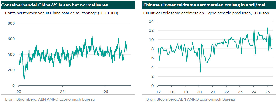 De vorige maand in Genève overeengekomen wapenstilstand verzachtte de belangrijkste tegenwind voor de Chinese economie. De momenteel geldende invoertarieven en wat er is overgebleven uit het verleden liggen dicht bij wat we hadden ingecalculeerd voor de start van deze handelsoorlog 2.0. Toch zijn de spanningen tussen de VS en China sinds Genève opgelopen, waarbij de focus is verschoven van tarieven naar ‘chokepoints’ - d.w.z. de levering van cruciale materialen waarvoor beide landen van elkaar afhankelijk zijn. Tijdens de escalatie van de handelsoorlog in april verscherpte China de exportcontroles op zeldzame aardmetalen en aanverwante producten, wat gevolgen dreigde te hebben voor de industrieën die afhankelijk zijn van deze grondstoffen in de VS, maar ook in de EU (die nog steeds met China onderhandelt over producten als elektrische voertuigen, medische apparatuur etcetera). Na een telefoongesprek tussen Trump en Xi en hernieuwde gesprekken in Londen lijken de VS en China te hebben weten te voorkomen dat de handelsbetrekkingen opnieuw uit de hand lopen. Onlangs werd een handelsraamwerk in aanvulling op het akkoord van Genève door beide landen bekrachtigd, waarbij afspraken zijn gemaakt over de Chinese export van zeldzame aard-metalen in ruil voor een versoepeling van Amerikaanse (tech)restricties. Al met al denken we dat de (handels)relatie tussen de VS en China stormachtig zal blijven, maar de reacties van de financiële markten, de lobby van bedrijven en de (chokepoint) afhankelijkheden hebben de kans op worstcasescenario's voorlopig verkleind.