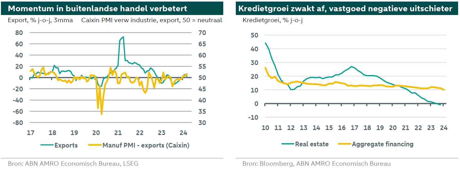 De bbp-groei versnelde in het eerste kwartaal van 2024, in lijn met ons basisscenario, gesteund door stimulerings-maatregelen en een herstel van de mondiale industrie. De laatste macrodata bevestigen echter dat het herstel nog steeds onevenwichtig is, waarbij de aanbodzijde sterker is dan de vraagzijde en de vastgoedsector nog steeds voor tegenwind zorgt. Ondertussen nemen de risico's van handelsconflicten toe.