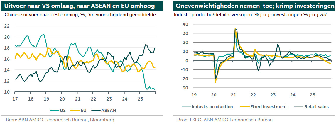 Ook de invoer in december overtrof de verwachtingen (+5,7% j‑o‑j), ondanks blijvende signalen van zwakke binnenlandse vraag. De detailhandelsverkopen vertraagden verder tot een post‑pandemisch dieptepunt van 0,9% j‑o‑j. Aan de aanbodzijde blijft de dynamiek veel sterker, met een versnelling van de industriële productie tot 5,2% j‑o‑j. Ondertussen blijft de vastgoedsector in zwaar weer: de jaarlijkse daling van zowel vastgoedinvesteringen als de verkoop van woningen nam verder toe. Het werkloosheidspercentage bleef stabiel op 5,1%.