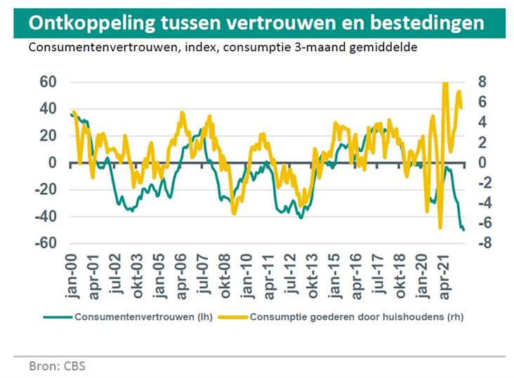 Het consumentenvertrouwen is in juni gedaald naar het laagste niveau ooit gemeten door het CBS. In juni kwam het vertrouwen uit op -50. Consumenten waren pessimistischer over zowel hun financiële situatie in de afgelopen twaalf maanden als die in de komende twaalf maanden. Daarnaast vonden zij de tijd voor het doen van grote aankopen nog ongunstiger dan in de afgelopen twaalf maanden. Dit heeft met name te maken met de sterke prijsstijgingen; 77 procent van de respondenten vond dat de prijzen in het afgelopen jaar sterk zijn gestegen.