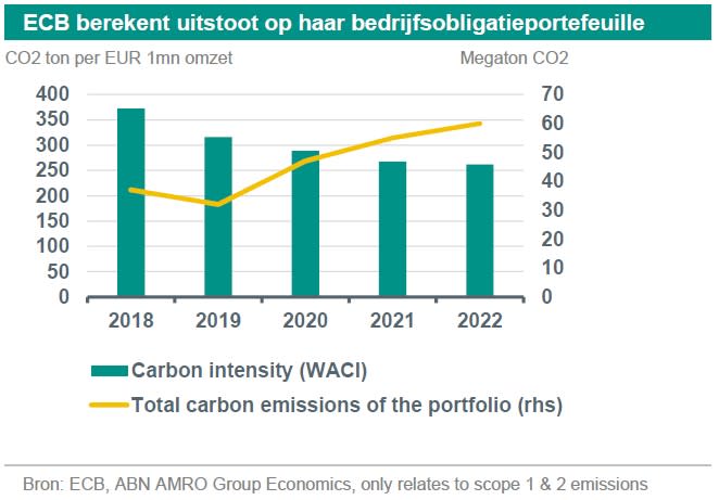 Twee weken geleden bereikte de ECB een mijlpaal met haar enorme bezit aan bedrijfsobligaties ter waarde van 344 miljard euro, aangekocht in het kader van het CSPP en het PEPP gedurende de periodes van monetaire verruiming. Voor het eerst heeft de centrale bank de CO2 impact van de portfolio gepubliceerd, omdat dit ook deel uitmaakte van haar eerdere klimaatactieplan om het publiek beter te informeren over hoe de centrale banken bijdragen aan klimaatverandering. Eerder had de centrale bank al besloten om de herbeleggingen van de obligatieaankopen, die naar verwachting binnenkort zullen worden beëindigd, te richten op uitgevers met betere klimaatprestaties op basis van drie pijlers, namelijk hun bestaande emissies, hun ambitie om de emissies te verminderen en de kwaliteit van hun klimaatinformatie.