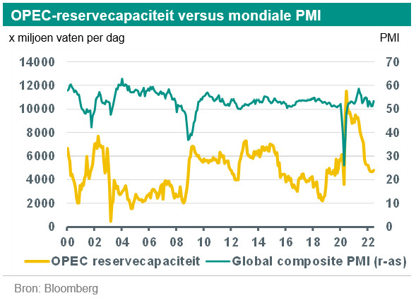 Ook aan de aanbodzijde zou de reactie van de markt anders kunnen zijn dan in het verleden. Ten eerste zullen alle ogen gericht zijn op de vergadering op 3 augustus om te zien hoe OPEC+ zal reageren op de marktomstandigheden, met Russische productie en export onder druk terwijl grote olieconsumenten (zoals de VS) om meer ruwe olie vragen om de hoge energieprijzen te bestrijden. Ten tweede kan de reserveproductiecapaciteit ditmaal een andere reactie vertonen ondanks een daling van de vraag naar olie ten gevolge van een geringere economische groei. Ten slotte is een gebrek aan investeringen iets waar we al langer op hebben gewezen. In het algemeen zijn de investeringen in exploitatie de laatste jaren aanzienlijk gedaald. Dit vertaalt zich ook in een lagere verwachte toekomstige productiecapaciteit, zowel van OPEC als van niet-OPEC. Mede daarom denken wij dat de voornaamste risico's voor de olieprijzen naar boven gericht blijven.