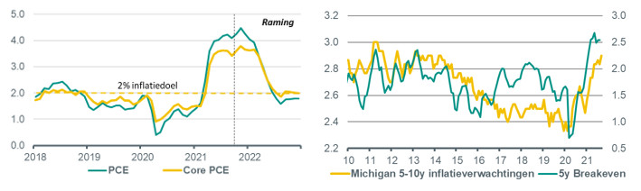 Inflatie zal volgend jaar teruglopen, terwijl verwachtingen goed verankerd blijven Linker figuur: Inflatie PCE, % j-o-j; Rechterfiguur: Inflatieverwachtingen, % j-o-j