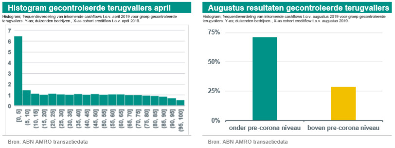 Voor zowel de ondernemers als voor het werkzame personeel is het relevant om te weten in hoeverre de weggevallen inkomende geldstromen weer terugkeren in de zomermaanden toen de restricties werden versoepeld. We hebben daarom specifiek voor de ondernemers die een gecontroleerde terugval doormaakten (12 procent van het totaal) geanalyseerd in hoeverre de inkomsten in de meest ‘open’ maand augustus weer terugkomen. De rechterfiguur hieronder toont in hoeverre de bedrijven in augustus onder of boven precorona-niveaus in termen van inkomende cashflows opereren.