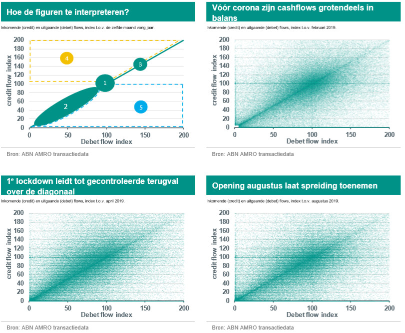 De eerste figuur laat met een voorbeeld zien hoe deze grafieken geïnterpreteerd kunnen worden. In het centrum van de figuren (aangegeven met 1) bevinden zich de bedrijven die ongeveer dezelfde inkomende en uitgaande geldstromen op hun rekeningen zien als het jaar ervoor. De bedrijven die gedurende de crisis hier blijven staan merken dus niet veel in termen van veranderende kasstromen.