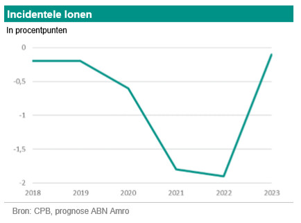 De incidentele loongroei, uitgedrukt in procentpunten ten opzichte van het contractloon om zo tot de totale loongroei te komen, is sinds 2014 negatief. aan onder andere jongeren die de arbeidsmarkt betreden, aan lagere opleidingsniveau’s en aan flexwerk. Door de hierboven genoemde aannames gaan we er van uit dat de incidentele loongroei momenteel nóg negatiever is dan de afgelopen jaren. Wel zou, door de grote bijdrage van jongeren en flexwerkers aan de incidentele loongroei, de verwachte minimumloonstijging hier iets van verandering in kunnen brengen. Grote delen van deze groepen verdienen namelijk het minimumloon of iets daarboven.