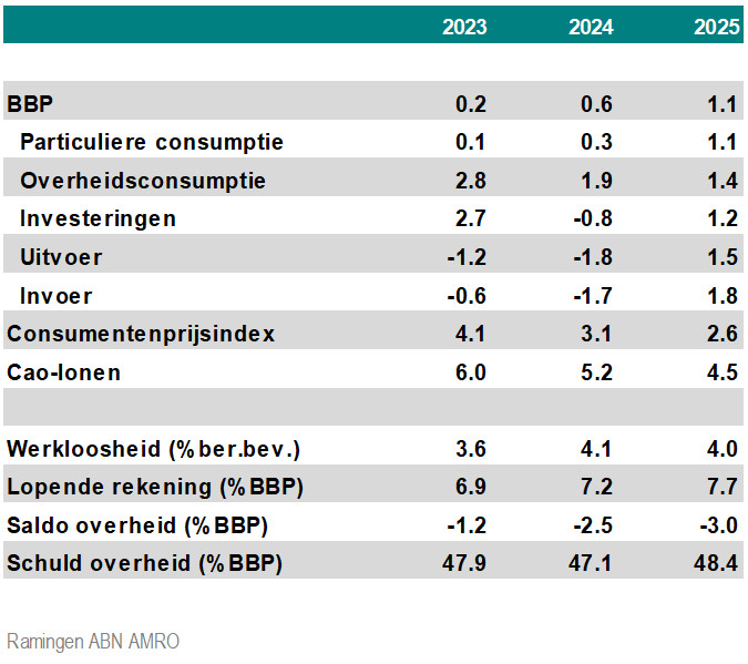 Nu de verkiezingen achter de rug zijn gaat de formatie van start. Anders dan de afgelopen jaren wordt er geformeerd tegen de achtergrond van zwakke groeivooruitzichten. Na drie kwartalen van krimp waait er nog steeds een gure economische tegenwind. De wereldeconomie vertraagt en hogere rentes blijven de economie afremmen. In 2024 kruipt de Nederlandse economie voorzichtig uit het dal. Neerwaartse renteaanpassingen komen door gunstigere inflatiecijfers dichterbij, waardoor ook de eurozone wat kan herstellen. De buitenlandse vraag neemt na een afname dit jaar, komend jaar langzaam toe. Binnenlands stimuleert de overheid de consumptieve bestedingen. De werkloosheid loopt marginaal op, zodat consumenten baanzekerheid houden. De bbp-groei blijft laag en komt in 2023 uit op 0,2% en trekt in 2024 aan tot 0,6%. In 2025, als renteniveaus verder dalen en de economische activiteit minder afgeremd wordt, trekt de bbp-groei verder aan richting 1,1%.