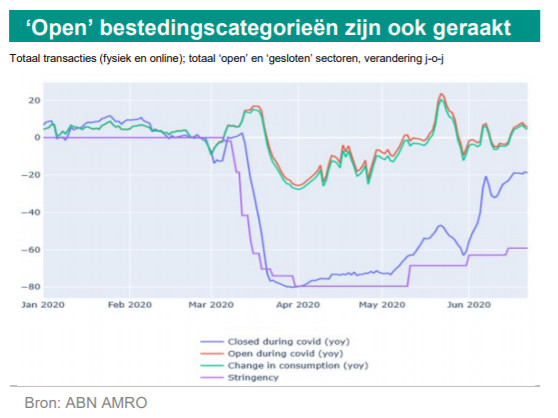 De bovenstaande grafiek maakt een onderscheid tussen sectoren die tijdens de lockdown de deuren moesten sluiten (zoals restaurants, wellness, entertaiment, cafés, kapperszaken) en alle andere sectoren die open mochten blijven. Het aantal transacties nam niet alleen af in sectoren die op slot gingen, maar ook in bestedingscategorieën waar bedrijven niet hoefden te sluiten, was het aantal transacties in april en mei aanmerkelijk lager.