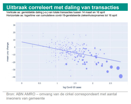 Een vergelijking van alle Nederlandse gemeentes door middel van regressieanalyse van paneldata (* ) laat zien dat het aantal covid-19-besmettingen in een Nederlandse gemeente een statistisch significant negatief effect heeft op het volume van lokale fysieke transacties door consumenten. Met andere woorden, gemeentes in Nederland waar covid-19 hard toesloeg, kenden moeilijkere economische tijden dan gemeentes met weinig of geen besmettingen. De modellen in deze studie zijn gecorrigeerd voor gemeentespecifieke kenmerken, zoals bevolkingsdichtheid en aantal cafés en restaurants. Dit effect wordt geïllustreerd in de twee grafieken hieronder voor het totaal aantal pintransacties in Amsterdam en Groningen. In Groningen bleef de eerste covid-19-golf relatief beperkt, terwijl in Amsterdam het virus sterk om zich heen greep. Het totaal aantal transacties was in Amsterdam na het instellen van de lockdown 55% lager dan in dezelfde periode van vorig jaar. In Groningen was dit circa 40%. Aan het einde van de lockdownperiode waren in Amsterdam de transacties nog niet terug op het oude niveau, terwijl in Groningen het herstel al snel inzette. Dit verschil houdt geen verband met lockdownmaatregelen, want in alle gemeentes was de lockdown even streng en ging deze op dezelfde datum in. Hieruit concluderen we dat consumenten minder gaan uitgeven wanneer het virus zich sneller verspreidt, ongeacht eventuele lockdownmaatregelen.
