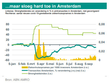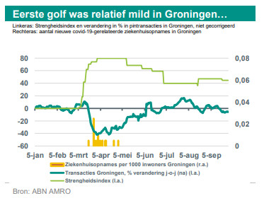 Door lockdowns zijn economieën wereldwijd, waaronder ook de Nederlandse, in een ernstige recessie beland. De figuur links hieronder toont het verloop van de strengheidsindex van overheidsreacties in verschillende Europese landen*. Economen gaan in het algemeen uit van een direct verband tussen de strengheid van de lockdown en het verlies van bbp-groei. Dit zal wellicht waar zijn, maar vertelt niet het volledige verhaal. Zo kromp ook in Zweden, waar de maatregelen in vergelijking met andere Europese landen relatief mild waren, de economie in het tweede kwartaal sterk (-8,3% k-o-k). In Nederland, waar de maatregelen qua zowel timing als strengheid vergelijkbaar waren met die in de meeste andere West-Europese landen, daalde het bbp (-8,5% k-o-k) ongeveer even hard als in Zweden. De lockdownmaatregelen kunnen de economie rechtstreeks raken, maar de ernst van de virusuitbraak zelf heeft ook schadelijke effecten. Dit komt ook naar voren in de grafiek rechts hieronder. Deze grafiek toont de correlatie tussen de omvang van de virusuitbraak (zoals gemeten naar het aantal covid-19-gerelateerde ziekenhuisopnames) en de daling van het totaal aantal transacties door ABN AMRO betaalpashouders in Nederland.